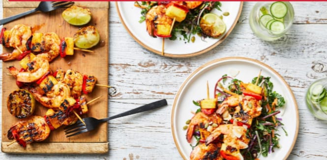 Capsicum, pineapple and prawns can be threaded onto skewers up to